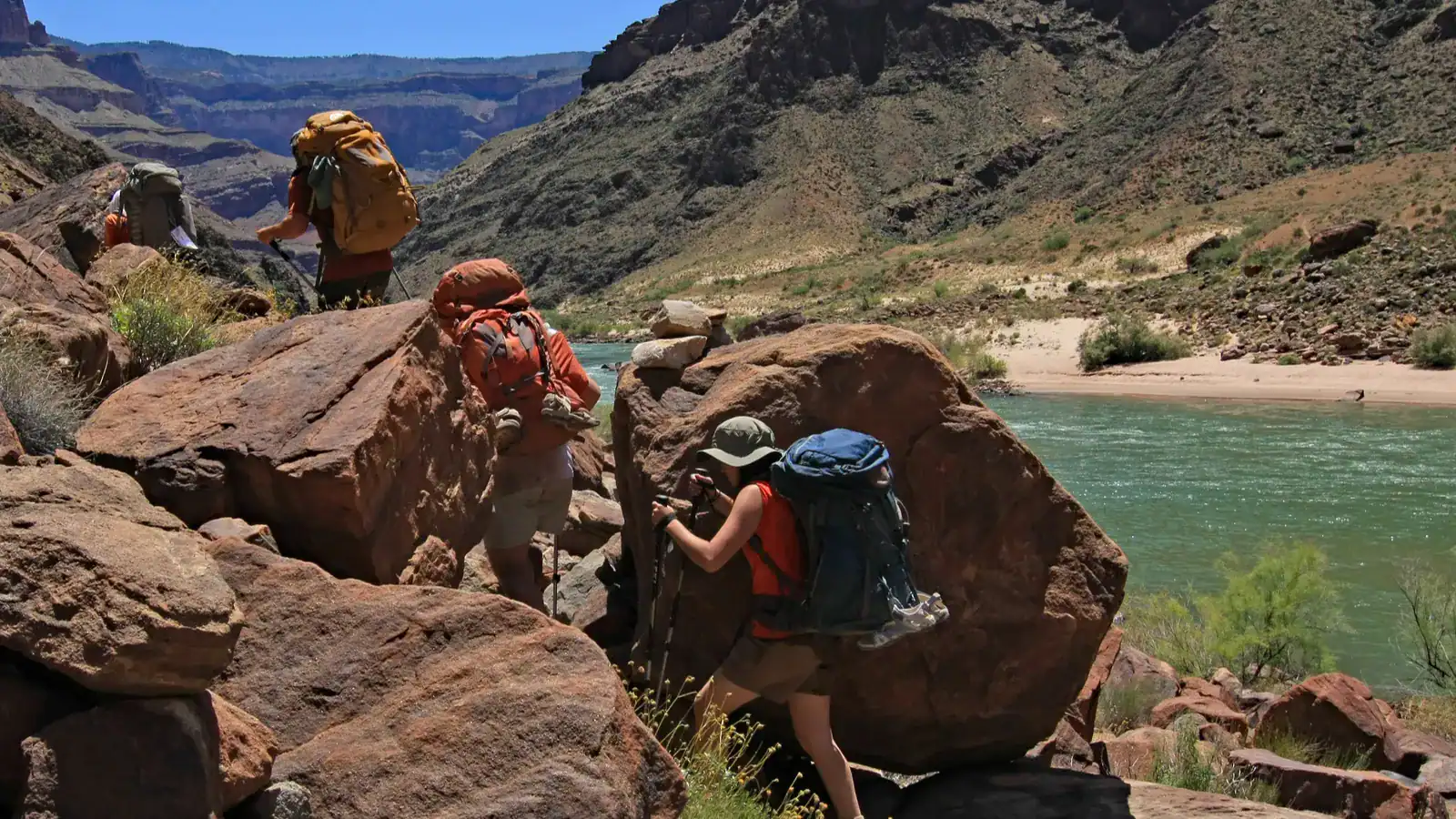 backpackers on backcountry trail by colorado river in grand canyon Author: fblanco7305 License ID: 349264156