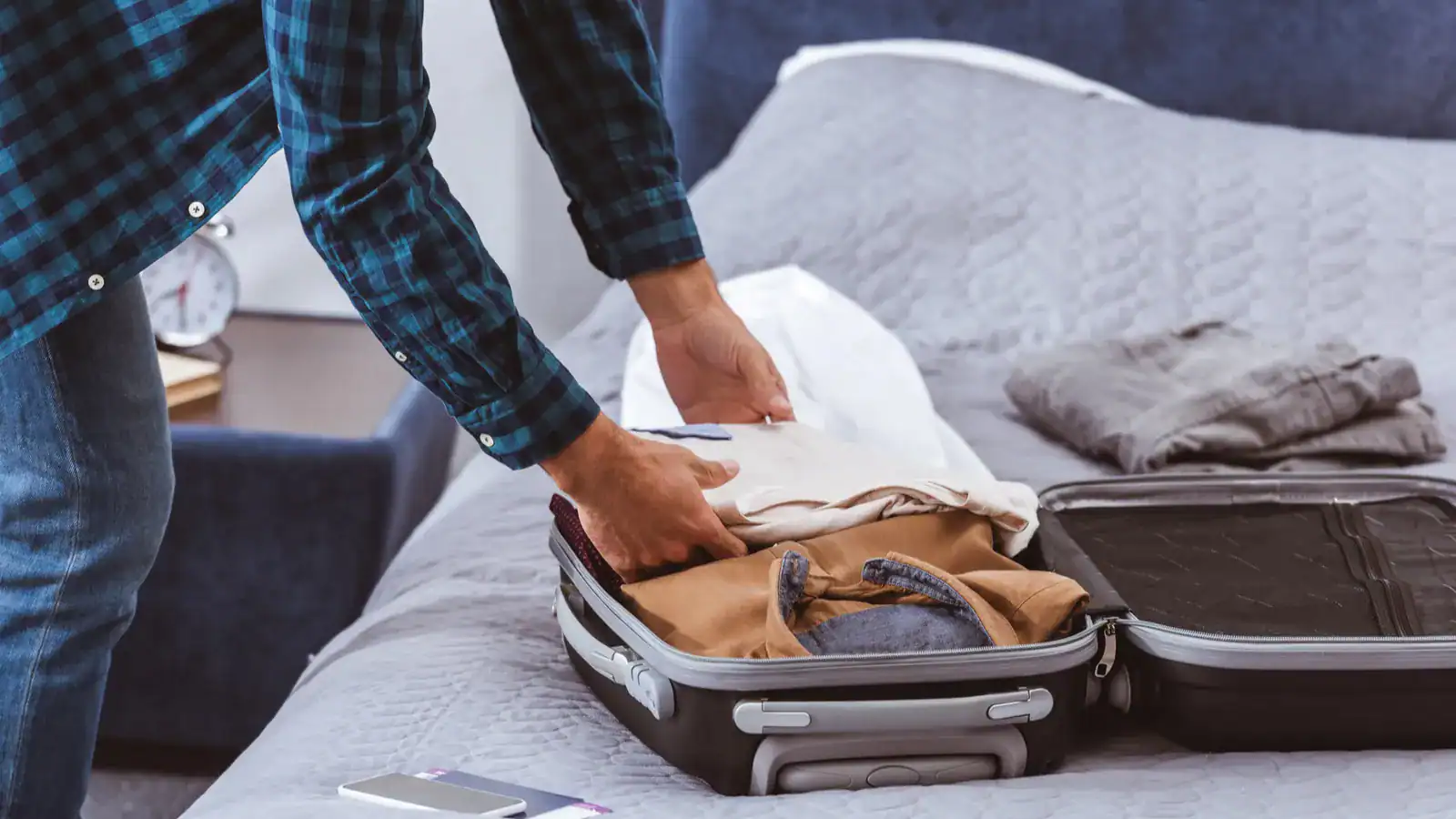 cropped image of male traveler packing luggage in bedroom at Author: AndrewLozovyi License ID: 349260106
